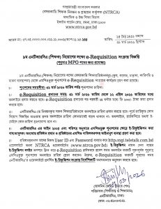 এনটিআরসিএ এর আইন ২০০৫ এবং পরিপত্র অনুসারে এমপিওভুক্ত শূন্যপদের ক্ষেত্রে ই-রিকুইজিশন করা বাধ্যতামূলক। অন্যথায় প্রতিষ্ঠান প্রধান ও প্রতিষ্ঠানের এমপিও বাতিলকরণসহ আইনানুগ ব্যবস্থা গ্রহণা করা হবে। প্রতিষ্ঠানপ্রধানগণ তাদের নিজস্ব User ID এবং Password ব্যবহার করে তথ্য প্রদান করকে হবে।